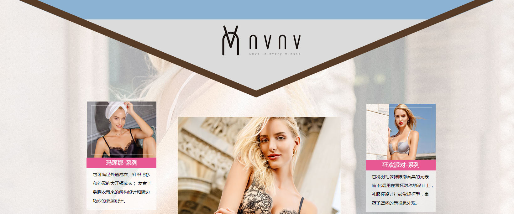 源自意大利的未來(lái)的潮流設計師品牌NVNV是浙江恩薇健康科技有限公司(意大利公司名Olivo Srls)旗下的舒適高級內衣品牌, 結合中國女性不同時(shí)期的形體特征和審美訴求,邀請設計專(zhuān)家于意大利當地深入探究多年,采用歐洲原創(chuàng )個(gè)性設計和制衣手法, 在意式經(jīng)典基礎上衍生新意,最終打造出屬于中國女性的潮流設計師內衣品牌NVNV。NVNV品牌致力于打造集高品質(zhì)、黑科技、舒適、高貴優(yōu)雅、舒適自由于一體的內衣,專(zhuān)注于淋漓展現女性理想胸型、自然曲線(xiàn),滿(mǎn)足亞洲女性不同時(shí)期的身材要求,因而產(chǎn)品依據少女(青春)、孕期(孕中和產(chǎn)后修復及哺乳期)、成熟女性(孕后)等三大階段,研發(fā)出瑪蓮娜、花神、舞裙、狂歡派對、席爾瓦娜、自由暢享、健康孕期、健康孕哺等八大系列產(chǎn)品,使亞洲新生代女性在每個(gè)人生階段都能展示理想身型,成為身材美學(xué)家,并為其帶來(lái)源自意大利的未來(lái)時(shí)尚生活。